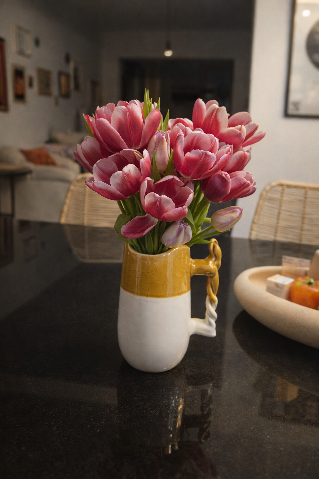 A handcrafted carafe with clean lines, adorned with a braided handle that combines elegance and functionality. Handcrafted by our Moroccan artisans, each piece embodies the authenticity of Mediterranean craftsmanship. Its timeless green design soothes the space while adding a touch of refinement to your table. Ideal for serving water or wine, it transforms every moment into a convivial and sophisticated experience.