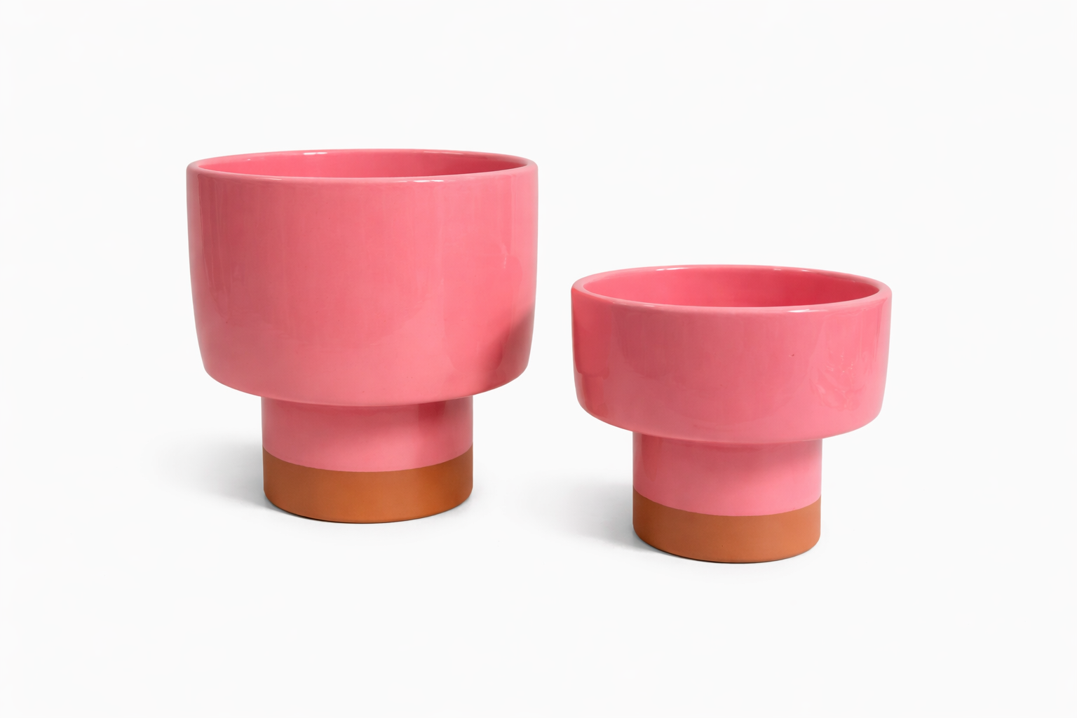 Le Piédestal Tagada apporte une touche joyeuse et solaire à l’intérieur avec sa silhouette basse, généreuse et parfaitement équilibrée. Son rose lumineux contrasté par une base terracotta évoque une esthétique méditerranéenne contemporaine, douce et audacieuse à la fois. Déclinés en deux tailles, ces pots décoratifs trouvent naturellement leur place sur une console, une étagère ou une table, comme objets à vivre entre esprit design et sensibilité artisanale.