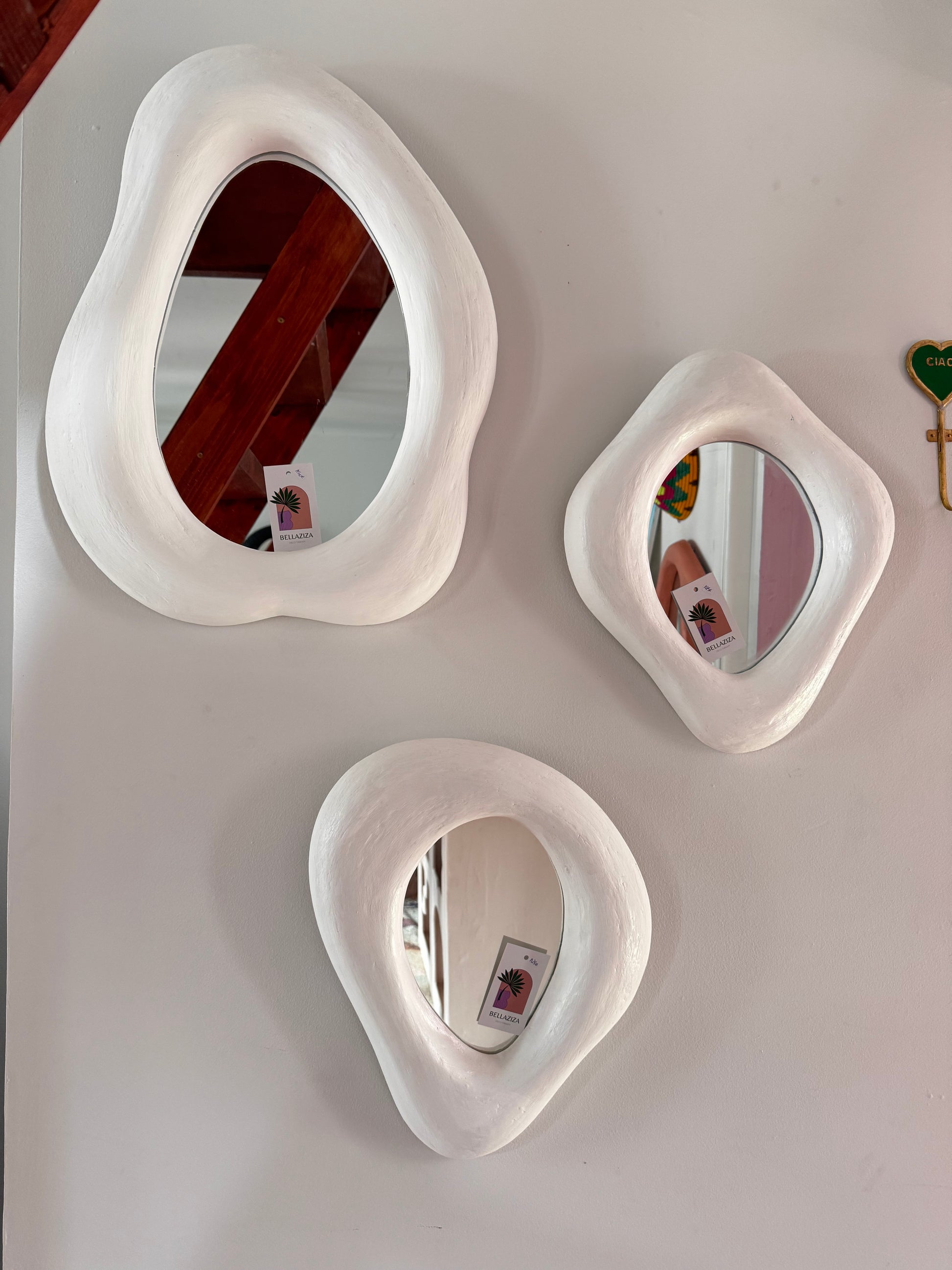 Minimaliste, sculptural et résolument Pinterest-friendly, ce petit miroir en plâtre blanc est modelé à la main au Maroc dans un format S plein de charme. Sa forme organique et irrégulière lui confère une touche arty qui sublime instantanément un mur, une étagère ou une coiffeuse.