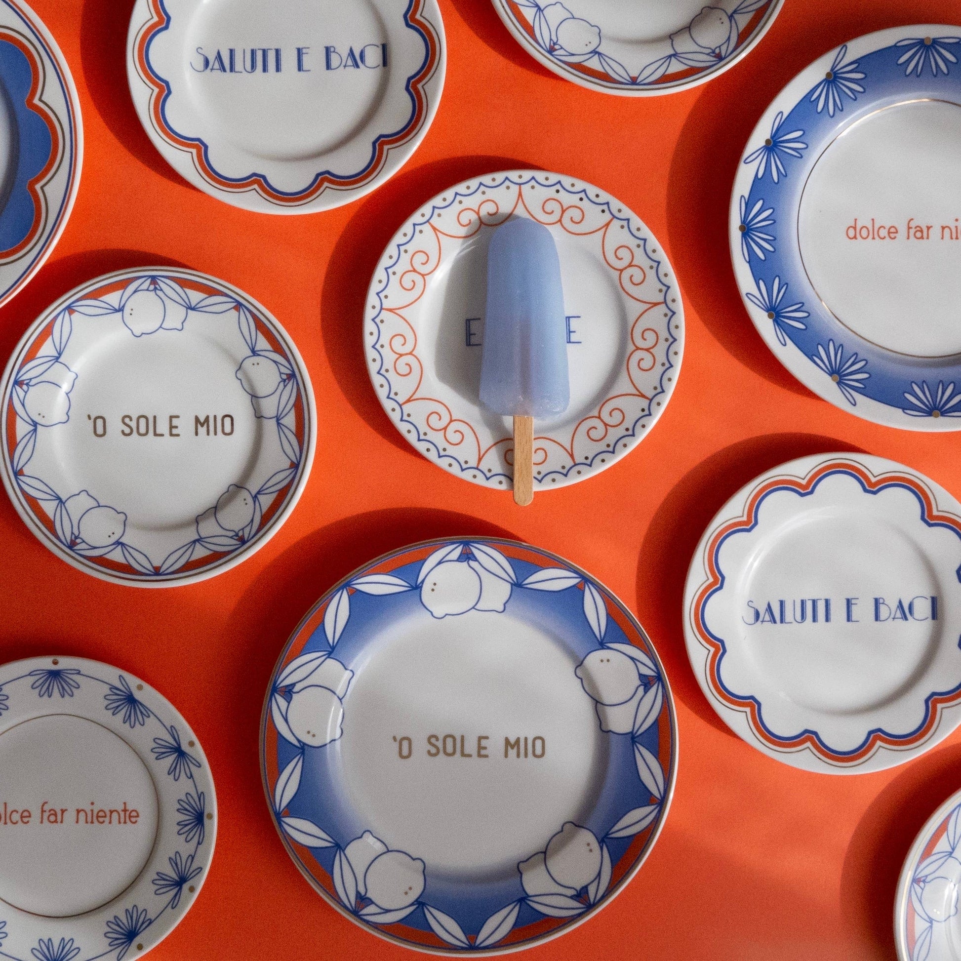 Collection Été Assiette en porcelaine, Ø 21 cm, en bleu, rouge et or. L'été est la période que j'associe aux voyages, aux aventures et aux amours fragiles, aux salutations envoyées par la poste et à la détente. Cette collection veut se souvenir de ces moments et transformer l'assiette en carte postale à emporter entre amis et en famille.
