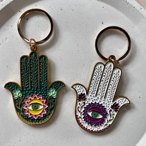 Trouvez la clé de votre bonheur avec ce porte-clé Hamsa! Avec un mélange joyeux de couleurs vives d'émail et de laiton, mettez une touche de chance à votre trousseau et rayonnez de bonnes vibrations partout où vous irez!