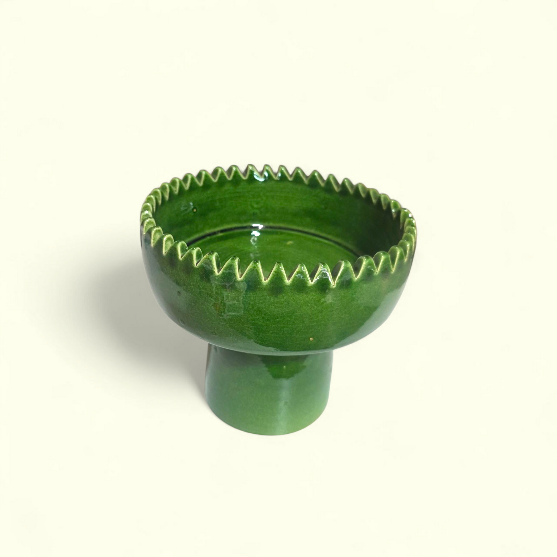 Plongez dans l’univers brut et vibrant du sud marocain avec ce saladier sur pied en céramique émaillée vert Tamgroute, issu d’un savoir-faire ancestral perpétué depuis des générations. Entièrement façonné à la main, il séduit par sa silhouette élancée, son bord dentelé et sa couleur verte profonde typique de la région de Tamgroute.