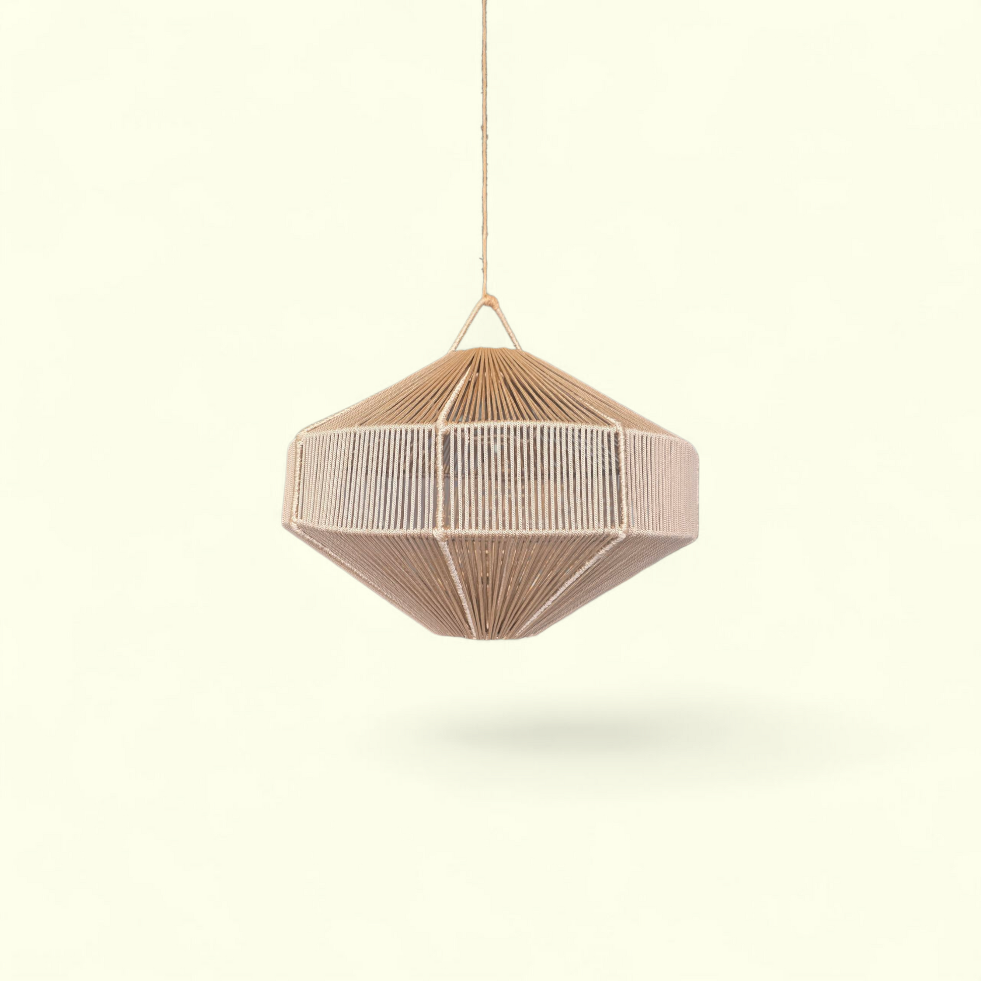 Légère, graphique et naturellement chaleureuse, cette suspension en cordage beige est entièrement réalisée à la main, alliant structure géométrique et texture douce. Sa forme en losange aplati et ses lignes tendues créent un jeu subtil d’ombres et de lumière une fois allumée.