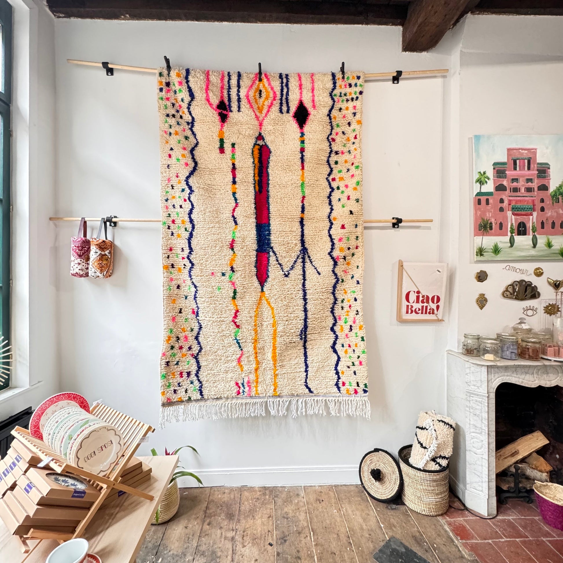 Il incarne l’artisanat marocain à son apogée, exclusivement chez BELLAZIZA.Chaque pièce est unique, reflet d’une tradition séculaire et d’une créativité sans limites. Les motifs vibrants et colorés, caractéristiques des tapis Azilal, apportent une touche artistique et chaleureuse à votre intérieur. Le mélange harmonieux de formes géométriques et de symboles traditionnels raconte une histoire riche en culture et en émotion.