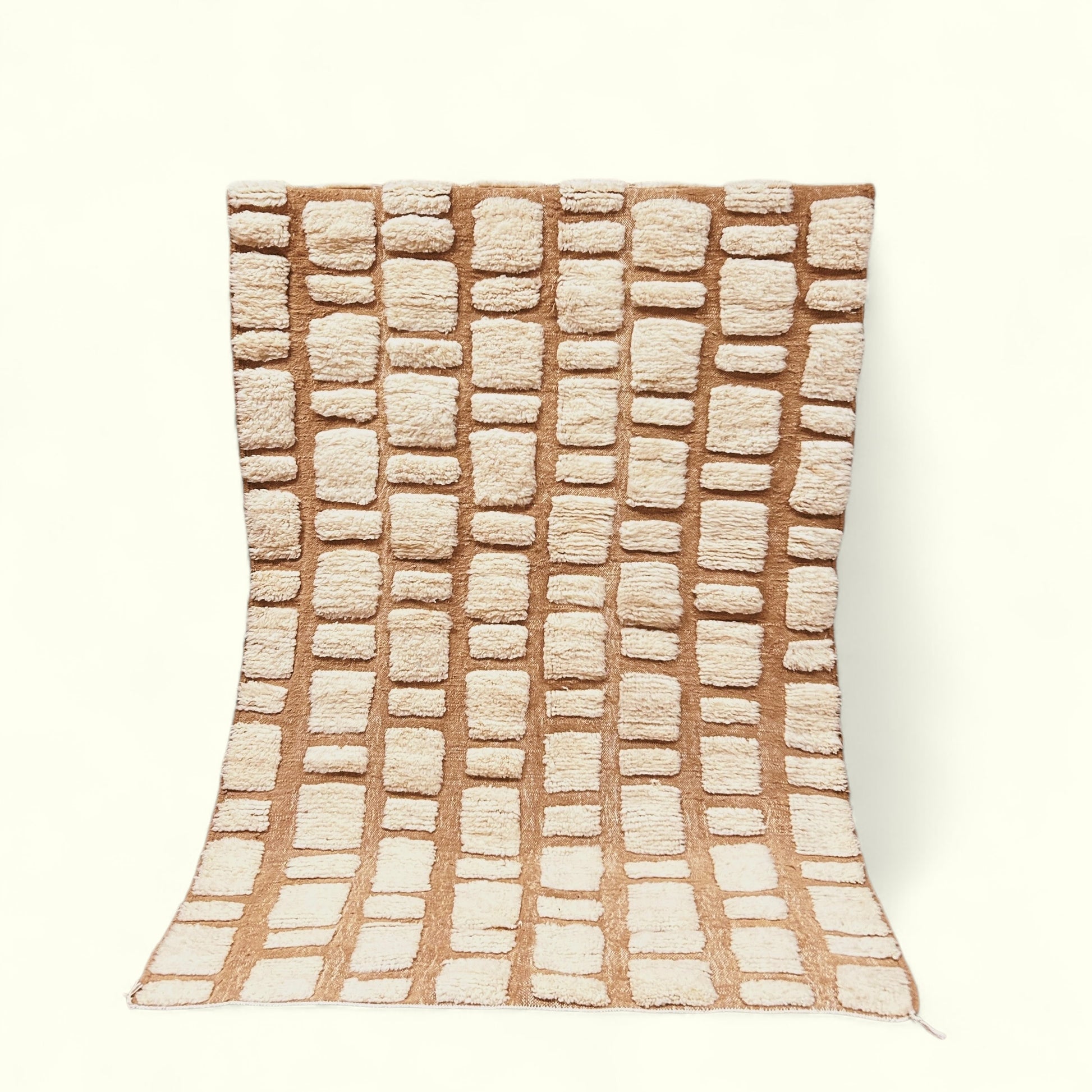 Plongez dans l'élégance avec notre tapis berbère au design exceptionnel, associant un fond camel vibrant à des carrés crème captivants. Conçu avec passion par une coopérative de femmes au Maroc, chaque pièce raconte une histoire artisanale unique. Transformez votre espace avec ce chef-d'œuvre uniquement disponible chez Bellaziza , l'essence même de la décoration tendance.